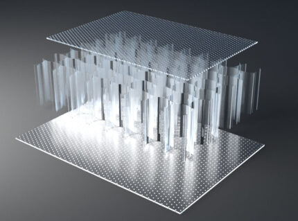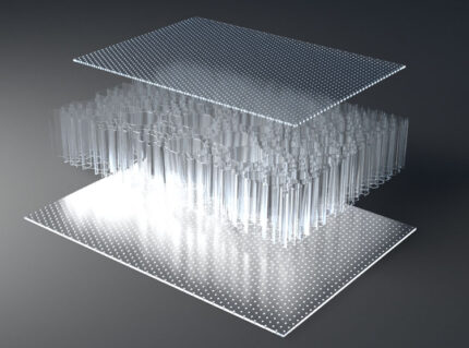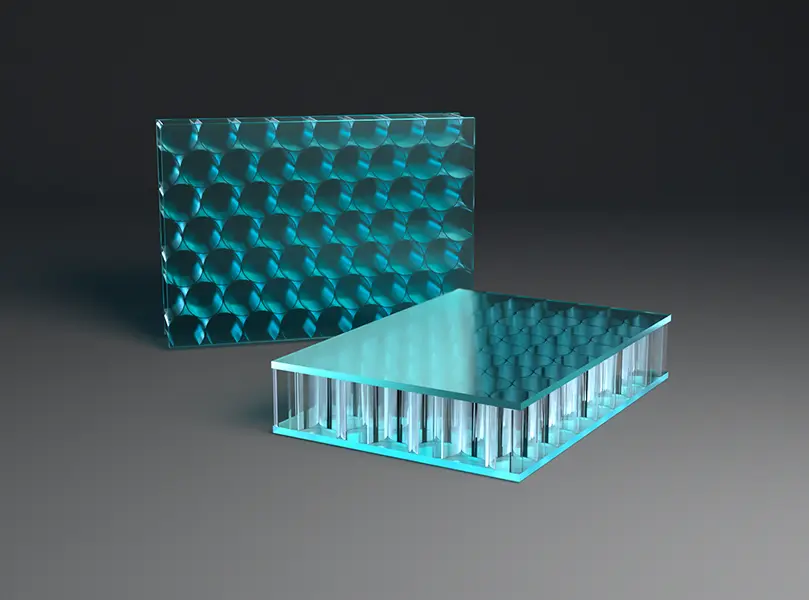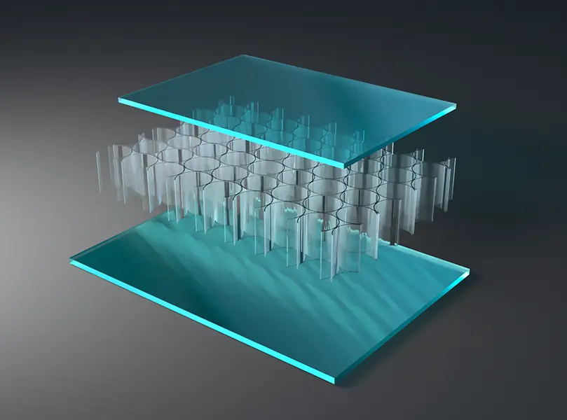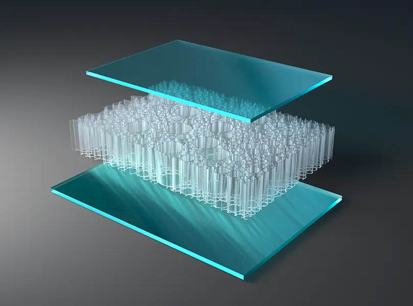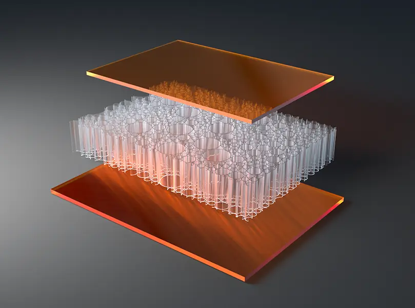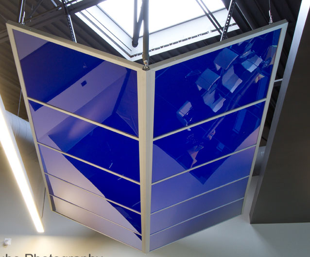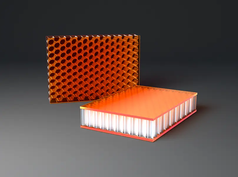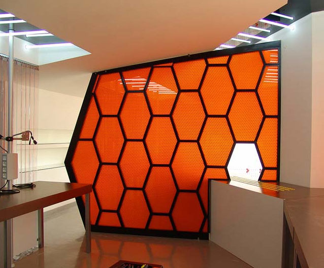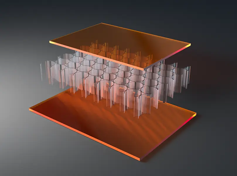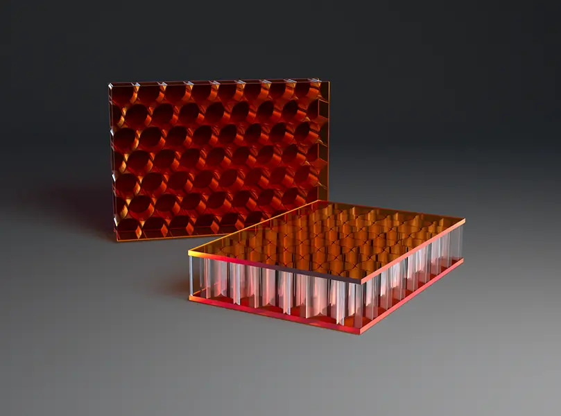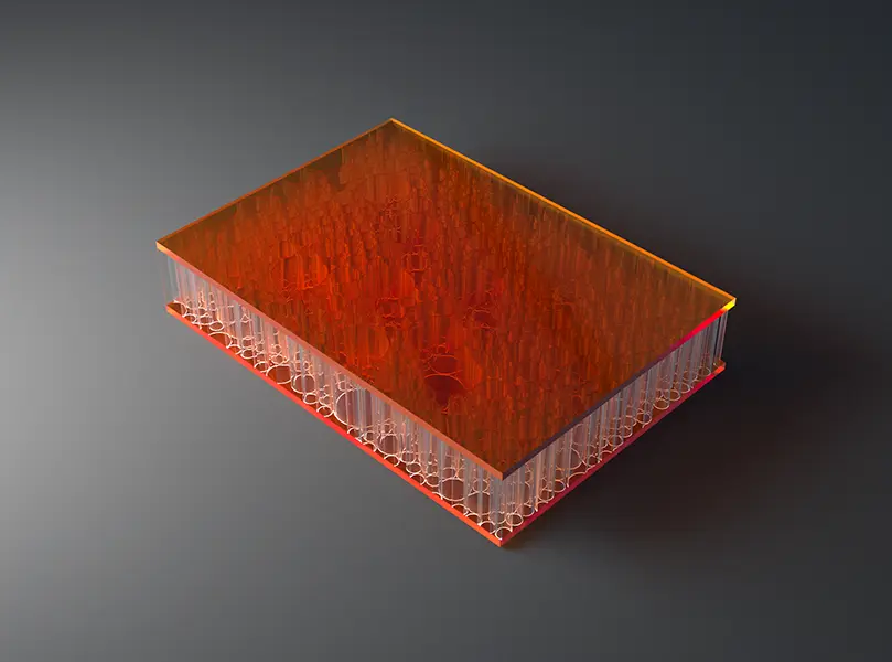 AIR-board® ECO color honeycomb panels are made with three polycarbonate (PC) core options and colored glossy PMMA-facing sheets. Facings are made with 100% recycled PMMA (R-MMA) and have the same excellent properties as standard PMMA made with a synthetic monomer and are 100% recyclable. These lightweight panels combined with different core options can be used in many different ways in interior architecture to suit the needs of your design. Visit the Resources section for edge finishing and other options.