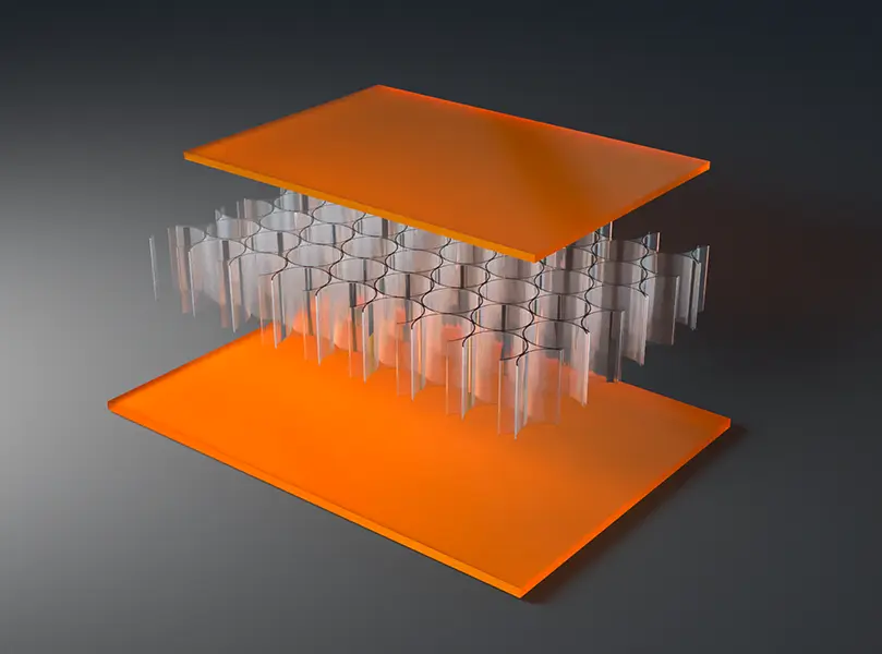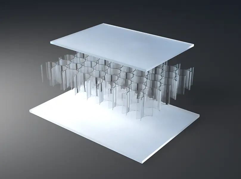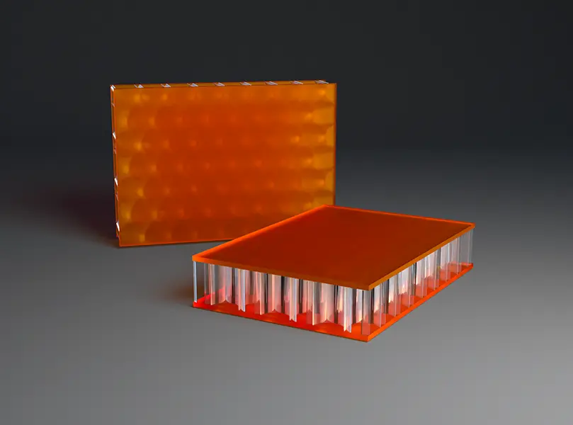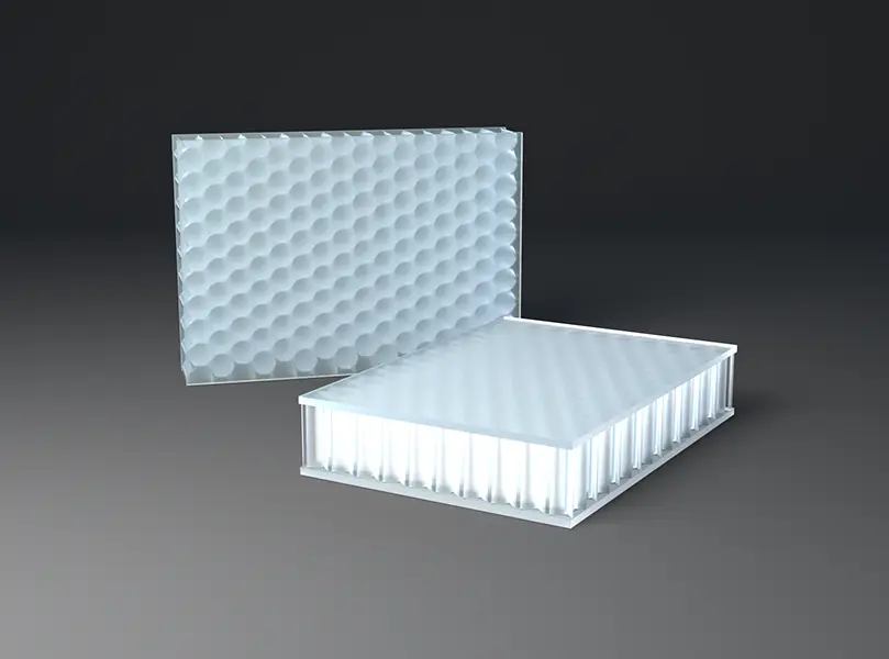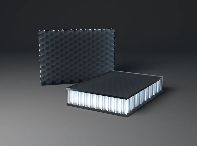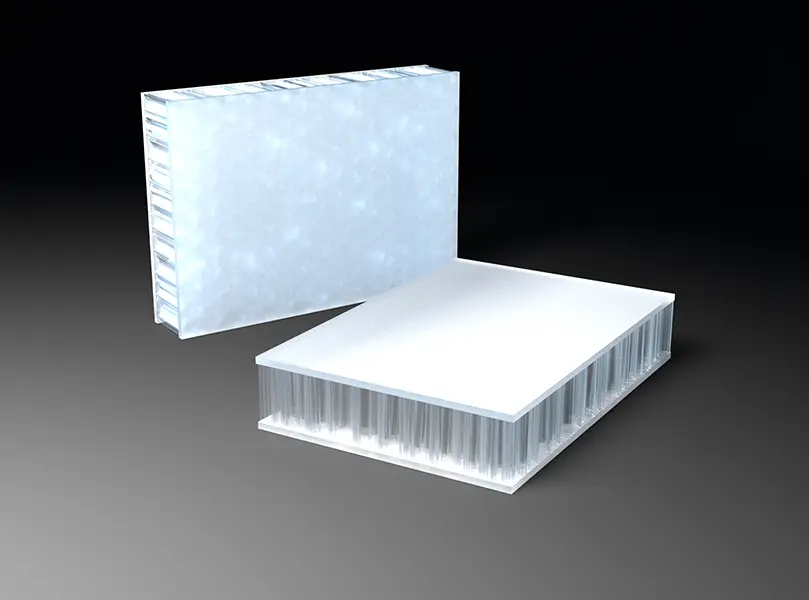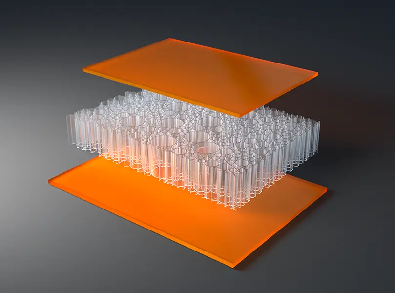 AIR-board® ECO satin panels are made with three polycarbonate (PC) core options and colored, satin-textured PMMA facing sheets. Facings are made with 100% recycled PMMA (R-MMA) and has the same excellent properties of standard PMMA made with a synthetic monomer and is 100% recyclable. These lightweight panels combined with different core options can be used in many different ways in interior architecture to suit the needs of your design. Visit the Resources section for edge finishing and other options.
