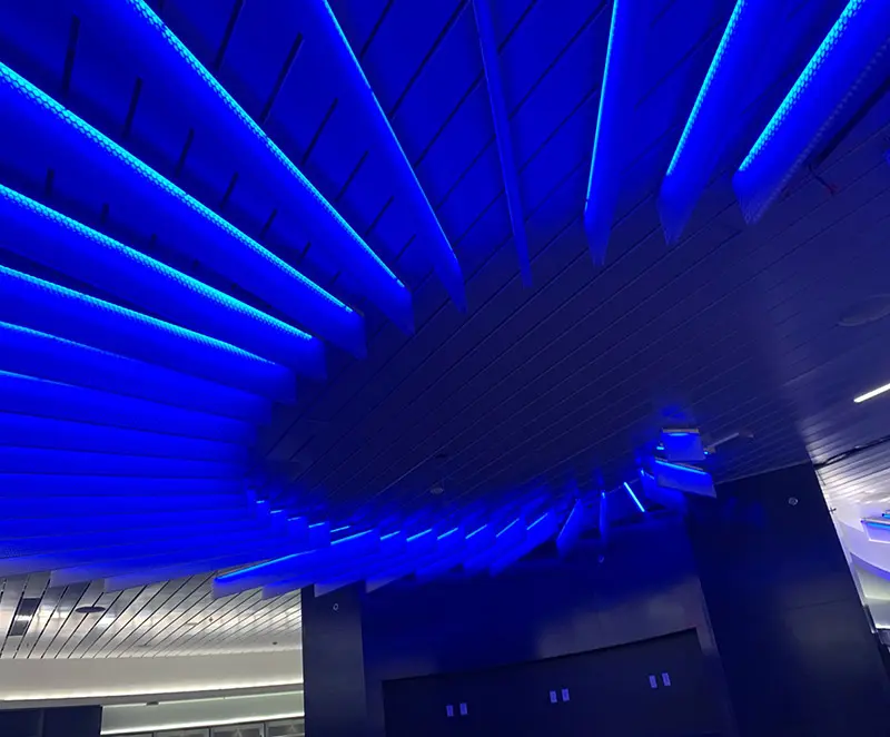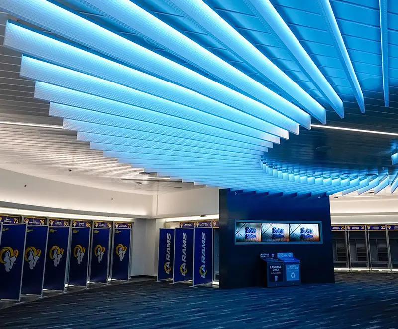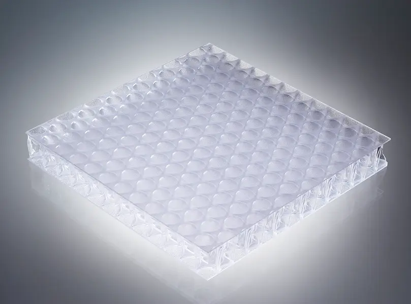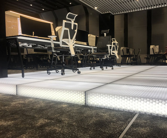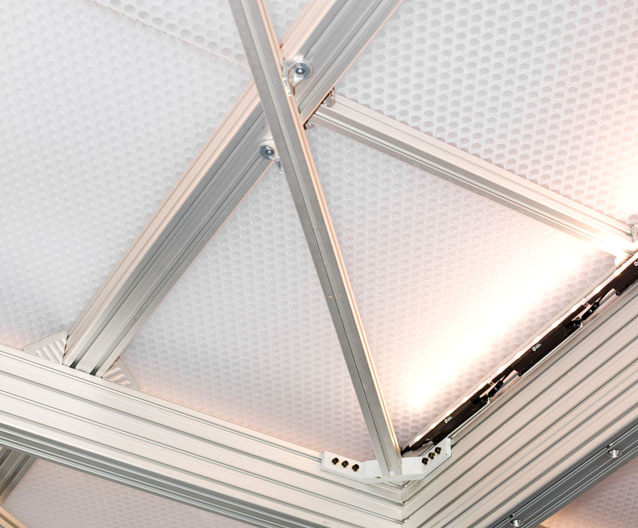 clear-PEP® ECO PC stage honeycomb panels are made with our patented polycarbonate TRIcore, made with our specially designed core expander. The innovative characteristics of the special cell structure give the lightweight panels unique visual depth but also high rigidity. PC ECO is the facing layers and has a bio-circular material content and low CO2 footprint. Normally manufactured using fossil fuels, these components have been replaced by bio-based renewable raw materials. The attributed share is up to 83% of the total material content. In addition, clear-PEP® ECO PC stage is 100% recyclable. These lightweight panels combined with different options can be used in many different ways in interior and exterior architecture to suit the needs of your design. Visit the Resources section for edge finishing and other options.